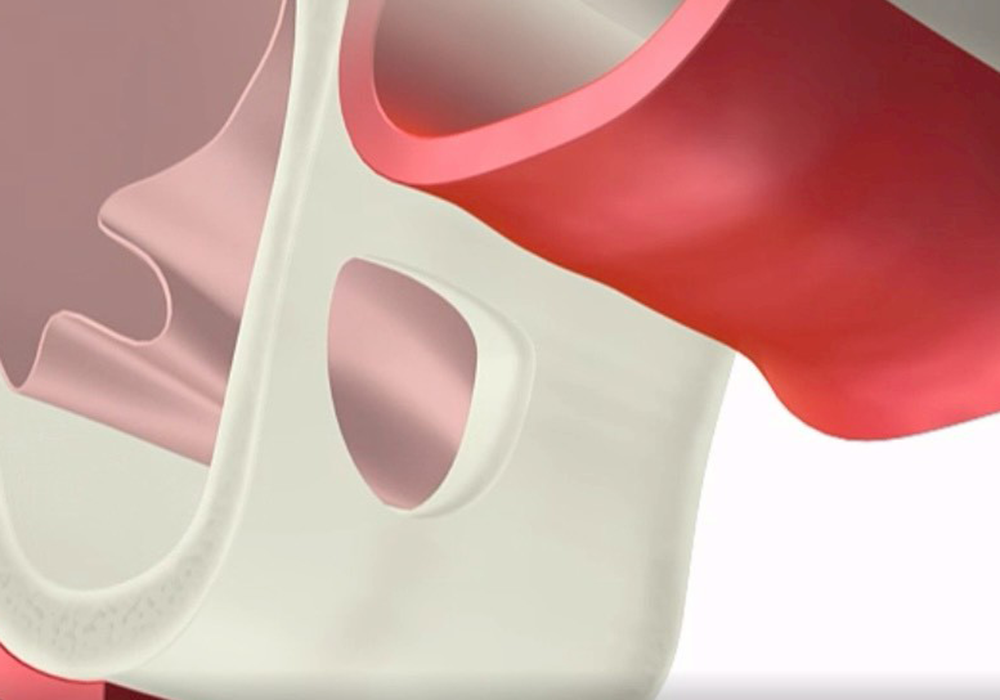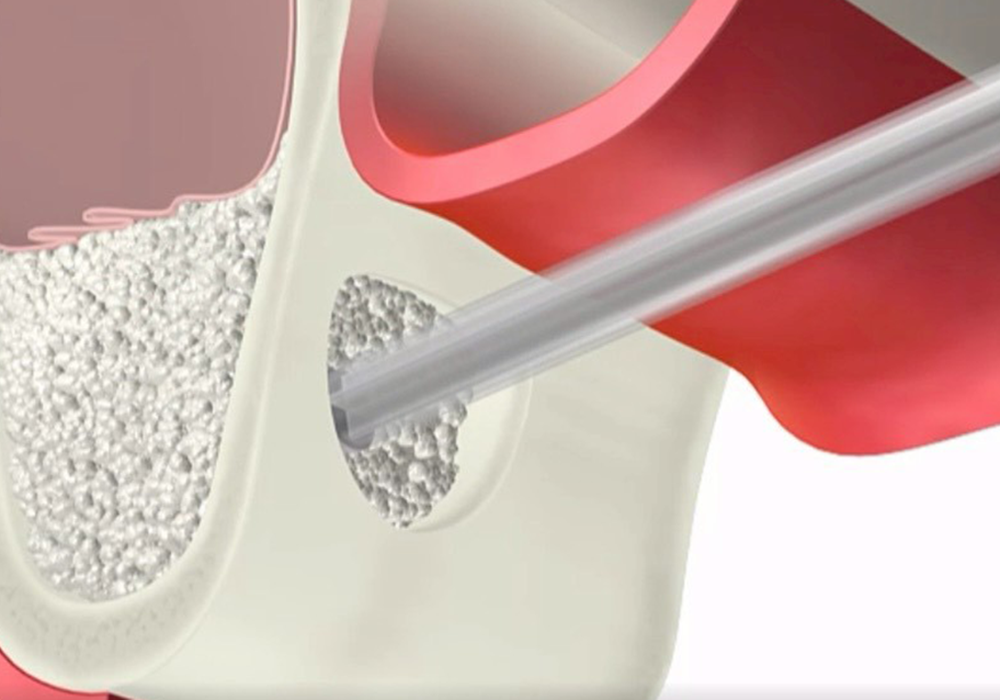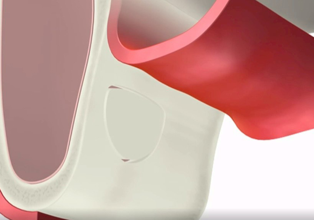 痛みが出ないように、麻酔をした後、歯肉頬粘膜を剥離翻転し、上顎洞側壁の骨を一部開けます。