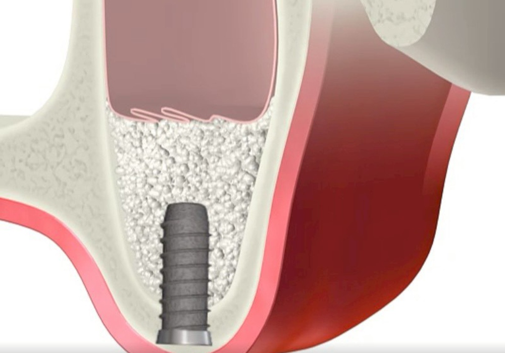現状では、満足のいく長さのインプラント体を埋入できる骨高径が不足しているため、インプラント体の埋入には骨高径(骨量)の増加が必要となります。上顎の骨は、上顎洞という空洞に接しており十分な骨高径を確保するためには、上顎洞粘膜の剥離挙上により空間を形成する必要があります。