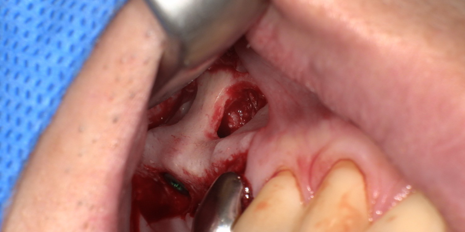 実際のオペの様子です。骨の窓開けがされており、上顎洞粘膜が挙上されている事が分かります。